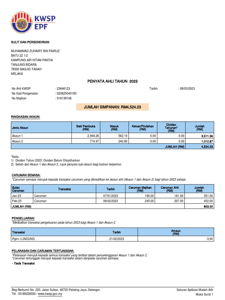 No Ahli KWSP : 23646123 Tarikh : 08/03/2023