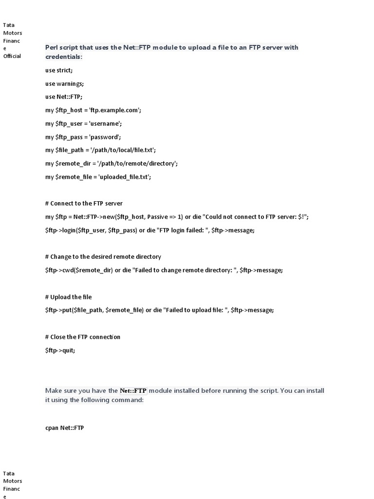 e Perl script that uses the Net::FTP module to upload a file to an FTP server with