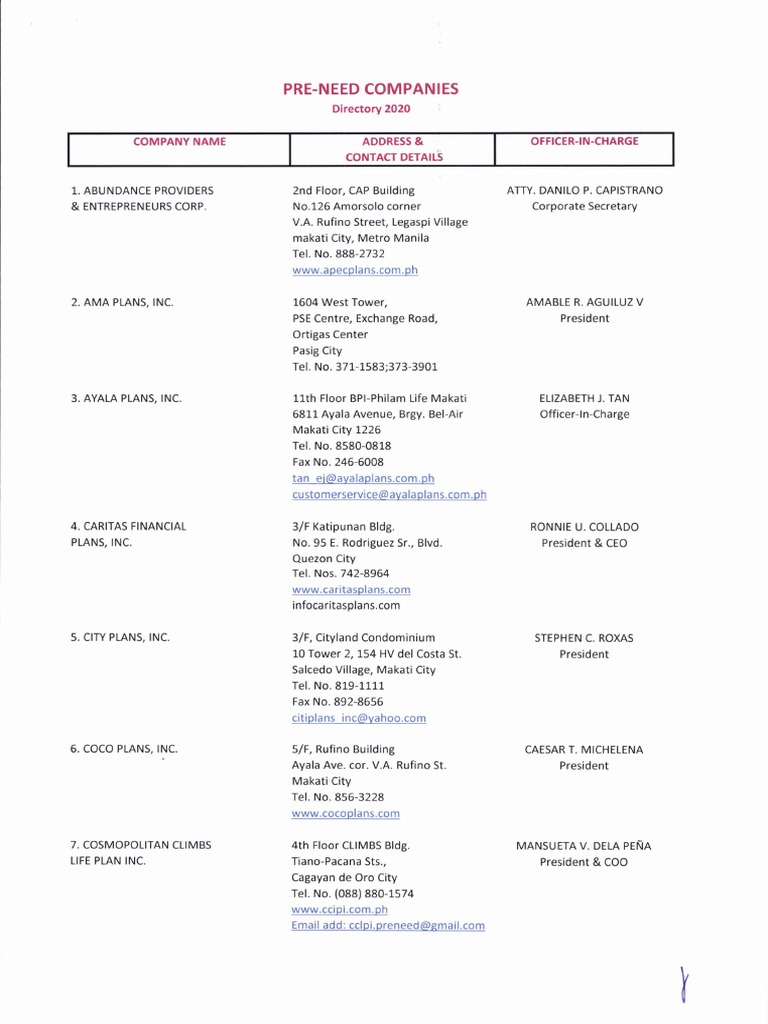 1. ABUNDANCE PROVIDERS 2nd Floor, CAP Building ATTY. DANILO P. CAPISTRANO