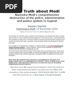 SIT Chairman RK Raghavan further comments that Modis statement accusing some elements in Godhra and the neighbourhood as possessing a criminal tendency was sweeping and offensive coming as it did from a chief minister, that too at a critical time when Hindu-Muslim tempers were running high. (Page 13 of SIT chairmans comments) The inquiry officer also notes: His (Modi) implied justification of the killings of innocent members of the minority community read together with an absence of a strong condemnation of the violence that followed Godhra suggest a partisan stance at a critical juncture when the state had been badly disturbed by communal violence. (Page 153) 2. The report says, in an extremely controversial move, the government of Gujarat had placed two senior ministers Ashok Bhatt and IK Jadeja in the Ahmedabad city police control room and the state police control room during the riots. The SIT chairman comments that the two ministers were positioned in the control rooms with no definite charter, fuelling the speculation that they had been placed to interfere in police work and give wrongful decisions to the field officers. The fact that he (Modi) was the cabinet minister for Home would heighten the suspicion that this decision had his blessings. (Page 12 of chairmans comments) (It is to be noted that Ashok Bhatts cell phone analysis showed that he was in touch with VHP leader Jaideep Patel, a key conspirator of the Naroda Gaon and Naroda Patiya massacre, and with Gordhan Zadaphia, the then minister of state for home and who is now seen by the SIT as a major culprit of the Ahmedabad massacres.) 3. The report affirms that police officers who took a neutral stand during the riots and prevented massacres were transferred by the Gujarat government to insignificant postings. SITs Raghavan has termed these transfers questionable since they came immediately after incidents in which the officers concerned were known to have antagonised ruling party men. (Pages 7-8 of chairmans comments) 4. The report says The Gujarat government has reportedly destroyed the police wireless communication of the period pertaining to the riots. It adds, No records, documentations or minutes of the crucial law and order meetings held by the government during the riots had been kept. (Page 13) (This is a shocking finding. Why were these official records destroyed? What was there to hide? It has to be remembered that the Gujarat government had constituted the Justice KG Shah Commission (which was later reconstituted as a two-member commission headed by Justice GT Nanavati with KG Shah as its member) on 6 March 2002, one month after the riots, to inquire into the circumstances around the riots and was thus dutybound to preserve police control room records and other documents and minutes of meetings as they could have been vital evidence of the partisan role played by the State machinery.) 5. The report says Modi displayed a discriminatory attitude by not visiting the riot-affected areas in Ahmedabad where a large number of Muslims were killed, though he went to Godhra on the same day, travelling almost 300 km on a single day. (Page 67) The SIT chairman also comments that Modi did not cite any specific reasons why he did not visit the affected areas in Ahmedabad city as promptly as he did in the case of the Godhra train carnage. (Page 8 of chairmans comments) 6. The SIT confirms that the government appointed VHP and RSS-affiliated advocates as public prosecutors in sensitive riot cases. The report states: It appears that the political affiliation of the advocates did weigh with the government for the appointment of public prosecutors. (Page 77) The SIT chairman further comments that it has been found that a few of the past appointees were in fact politically connected, either to the ruling party or organisations sympathetic to it. (Page 10 of chairmans comments) 7. According to the report, the Gujarat government did not take any steps to stop the illegal bandh called by the Vishwa Hindu Parishad on 28 February 2002. On the contrary the BJP had supported the bandh. (Page 69) (It is important to remember that it was Hindu mobs mobilised by the local VHP and BJP leaders in the name of bandhs that had carried out the horrific massacres at Naroda and Gulberg Society on 28 February 2002.) 8. The SIT report also says that, in an inexplicable move, the police administration did not impose curfew in Naroda until 12 pm and Meghani Nagar (Ahmedabad city) until 2 pm on 28 February 2002. By then, the situation had severely deteriorated at both places. 9. According to the SIT, despite detailed reports recommending strict action submitted to Modi by field officers of the State Intelligence Bureau, the Modi government failed to take action against a section of the print media that was publishing communally- inciting reports, inflaming base emotions. This had vitiated the communal situation further. (Page 79) 10. The SIT also asserts that in August 2002, in a bid to ensure an early Assembly election, top officials of the Modi government misled the Central Election Commission by presenting a picture of normalcy when the state was still simmering with communal tension. (Page 79 to 86) (The BJP had prematurely dissolved the Assembly on 19 August 2002, nine months before the expiry of the five-year term, and demanded an early election. The BJP clearly wanted to take electoral advantage of the communal polarisation.) 11.The SIT discovered that the state police had carried out patently shoddy investigations in the Naroda Patiya and Gulberg Society massacre cases. It deliberately overlooked the cell phone records of Sangh Parivar members and BJP leaders involved in the riots prominent among them were the Gujarat VHP president Jaideep Patel and BJP minister Maya Kodnani. If these records had been analysed and used as evidence, it could have established their complicity. (Pages 101-105) 12. Many senior police are now being investigated by the 