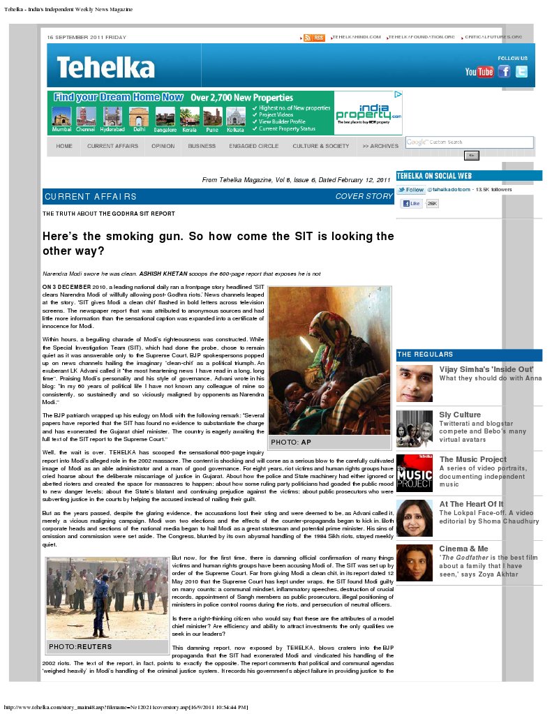 Tehelka - India's Independent Weekly News Magazine secretary (Home); Rakesh Asthana (presently commissioner of police of Vadodara city) and DG Vanzara (now in jail for staging encounter killings). The SIT also notes that, while conducting the trail of the Best Bakery Case, the additional sessions judge of Greater Bombay had made adverse comments and passed strictures against K Kumaraswamy, the then joint CP, Vadodara city and Ramjibhai Pargi, the then ACP, Vadodara city for attempting to subvert justice. But despite this overwhelming evidence of bias and prejudice, recorded in its own report, the SIT has concluded lamely that transfers and postings are the prerogative of the government. Modi displayed dangerously communal and prejudiced conduct during the riots but there isnt enough evidence to book him, says the SIT What does it take to hold a chief minister morally, if not legally responsible, for the willful deaths of 2,000 people in his state? On page 67 of the SIT report Malhotra notes, Narendra Modi, chief minister, has admitted to visiting Godhra on 27 February 2002. He has further admitted to visiting Gulberg Society, Naroda Patiya and other riot-affected parts of Ahmedabad city only on 5 March 2002 and 6 March 2002. Malhotra further writes: This possibly indicates his discriminatory attitude. He went to Godhra, travelling almost 300 km in a day, but failed to go to the local areas, where serious incidents of riots had taken place and a large number of Muslims were killed. On 1 March 2002, as the fire of communal riots was raging in Gujarat, in an interview to Zee News, Modi made the following remark: Kriya pratikriya ki chain chal rahi hai. Hum chahte hain ki na kriya ho aur na pratikriya (The process of action and reaction is on. I would say if action doesnt happen there would be no reaction). In the same interview, Modi had stated that Godhra Muslims had criminal tendencies and they were behind the gruesome Sabarmati train fire incident. And then added that the riots in Gujarat were a natural reaction to that. (Godhra ke is ilake ke logon ki criminal tendencies rahi hain. In logon ne pahle mahila teachers ka khoon kiya. Aura ab yeh jaghanya apraadh kiya hai jiski pratikriya ho rahi hai.) On page 69 of his report, Malhotra notes: It is to be stated that Narendra Modi has clearly stated in his Zee TV interview that it was late Ehsan Jafri, ex- MP, who first fired at the violent mob and the provoked mob stormed the society and set it on fire. In this interview he has clearly referred to Jafris firing as action and the massacre that followed as reaction. Malhotra further writes: It may thus be seen that in spite of the fact that ghastly violent attacks had taken place on Muslims at Gulberg Society and elsewhere, the reaction of the government was not the type that would have been expected by anyone. The above discussion also shows that the chief minister had tried to water down the seriousness of the situation at Gulberg Society, Naroda Patiya and other places by saying that every action has an equal and opposite reaction. He also says that Modis remarks implied justification of the killings of innocent members of the minority community and reflected his partisan mindset and thus were unbecoming of a chief minister. Raghavan has also termed Modis remarks as sweeping and offensive. However, Malhotra concludes by saying that such utterances itself are not sufficient to make out a case against Modi. Saffron brigade members of were appointed public prosecutors in riot cases, but tough to pinpoint instances of misconduct, says SIT As this detailed analysis shows, in almost every aspect, the SIT report is an exasperating study in contradictions. While the inquiry officer admits malfeasance on the part of Modi and his government on several counts, he has shown inexplicable reluctance in recommending a further detailed investigation. Nowhere is this better illustrated than the section dealing with the appointment of VHP and RSS members as public prosecutors. On page 157, Malhotra records that a pro-VHP advocate named Raghuvir Pandya was appointed as government pleader in the Vadodara District and Sessions Court in 2002. Pandya conducted the trial of the infamous Best Bakery case which resulted in the acquittal of all the accused. Malhotra further writes that the Supreme Court of India had passed serious strictures on the role played by Pandya in this trial which deserves to be brought to the notice of the Bar Association for suitable action as deemed fit. Malhotra lists five more instances of VHP or RSS leaders being appointed as public prosecutors. He mentions that political consideration and affiliation of the advocates weighed heavily with the government in these appointments. Then he contradicts himself by saying that no specific allegation of professional misconduct on the part of any of the public prosecutors has come to light. Again and again, one is flummoxed by the SITS timidity in driving its own findings to their natural conclusions. For instance, the SIT found that Gujarat VHP General Secretary Dilip Trivedi was a public prosecutor in Mehsana district between April 2000 and December 2007, with more than a dozen public prosecutors working under him. Mehsana was among the worst riot affected areas. Two riot cases in Mehsana in particular the Deepda Darwaza killings in Visnagar town and the Sardarpura massacre were most horrific. During TEHELKAs sting investigation, in a conversation with the undercover reporter, Trivedi had boasted about how he had camped in every district of Gujarat holding meetings with government prosecutors, VHP workers, police officers and defence advocates to ensure bail and acquittals for the Hindu accused. He proudly told the TEHELKA reporter that out of a total 74 riot-related cases in Mehsana, only two had resulted in conviction. Yet, the same SIT that had cited this TEHELKA reporter as a prosecution witness in three riot cases, now refused to take on 