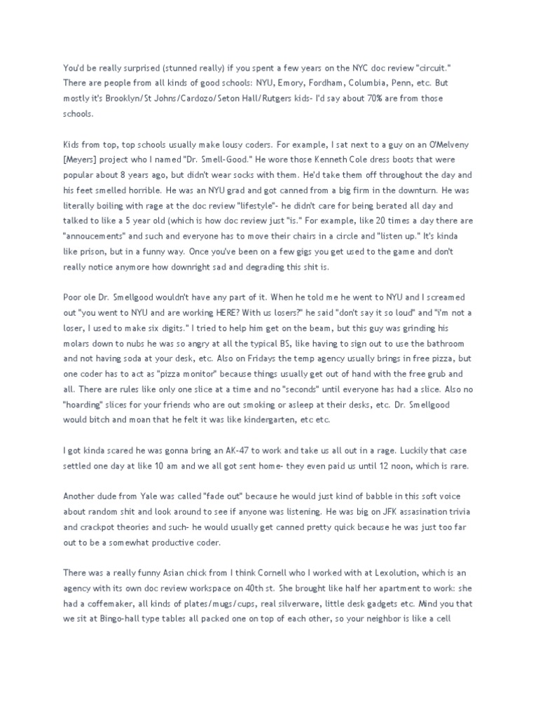 " There are people from all kinds of good schools: NYU, Emory, Fordham, Columbia, Penn, etc. But mostly it's Brooklyn/St Johns/Cardozo/Seton Hall/Rutgers kids- I'd say about 70% are from those schools. Kids from top, top schools usually make lousy coders. For example, I sat next to a guy on an O'Melveny [Meyers] project who I named "Dr. Smell-Good." He wore those Kenneth Cole dress boots that were popular about 8 years ago, but didn't wear socks with them. He'd take them off throughout the day and his feet smelled horrible. He was an NYU grad and got canned from a big firm in the downturn. He was literally boiling with rage at the doc review "lifestyle"- he didn't care for being berated all day and talked to like a 5 year old (which is how doc review just "is." For example, like 20 times a day there are "annoucements" and such and everyone has to move their chairs in a circle and "listen up." It's kinda like prison, but in a funny way. Once you've been on a few gigs you get used to the game and don't really notice anymore how downright sad and degrading this shit is. Poor ole Dr. Smellgood wouldn't have any part of it. When he told me he went to NYU and I screamed out "you went to NYU and are working HERE? With us losers?" he said "don't say it so loud" and "i'm not a loser, I used to make six digits." I tried to help him get on the beam, but this guy was grinding his molars down to nubs he was so angry at all the typical BS, like having to sign out to use the bathroom and not having soda at your desk, etc. Also on Fridays the temp agency usually brings in free pizza, but one coder has to act as "pizza monitor" because things usually get out of hand with the free grub and all. There are rules like only one slice at a time and no "seconds" until everyone has had a slice. Also no "hoarding" slices for your friends who are out smoking or asleep at their desks, etc. Dr. Smellgood would bitch and moan that he felt it was like kindergarten, etc etc. I got kinda scared he was gonna bring an AK-47 to work and take us all out in a rage. Luckily that case settled one day at like 10 am and we all got sent home- they even paid us until 12 noon, which is rare. Another dude from Yale was called "fade out" because he would just kind of babble in this soft voice about random shit and look around to see if anyone was listening. He was big on JFK assasination trivia and crackpot theories and such- he would usually get canned pretty quick because he was just too far out to be a somewhat productive coder. There was a really funny Asian chick from I think Cornell who I worked with at Lexolution, which is an agency with its own doc review workspace on 40th st. She brought like half her apartment to work: she had a coffemaker, all kinds of plates/mugs/cups, real silverware, little desk gadgets etc. Mind you that we sit at Bingo-hall type tables all packed one on top of each other, so your neighbor is like a cell