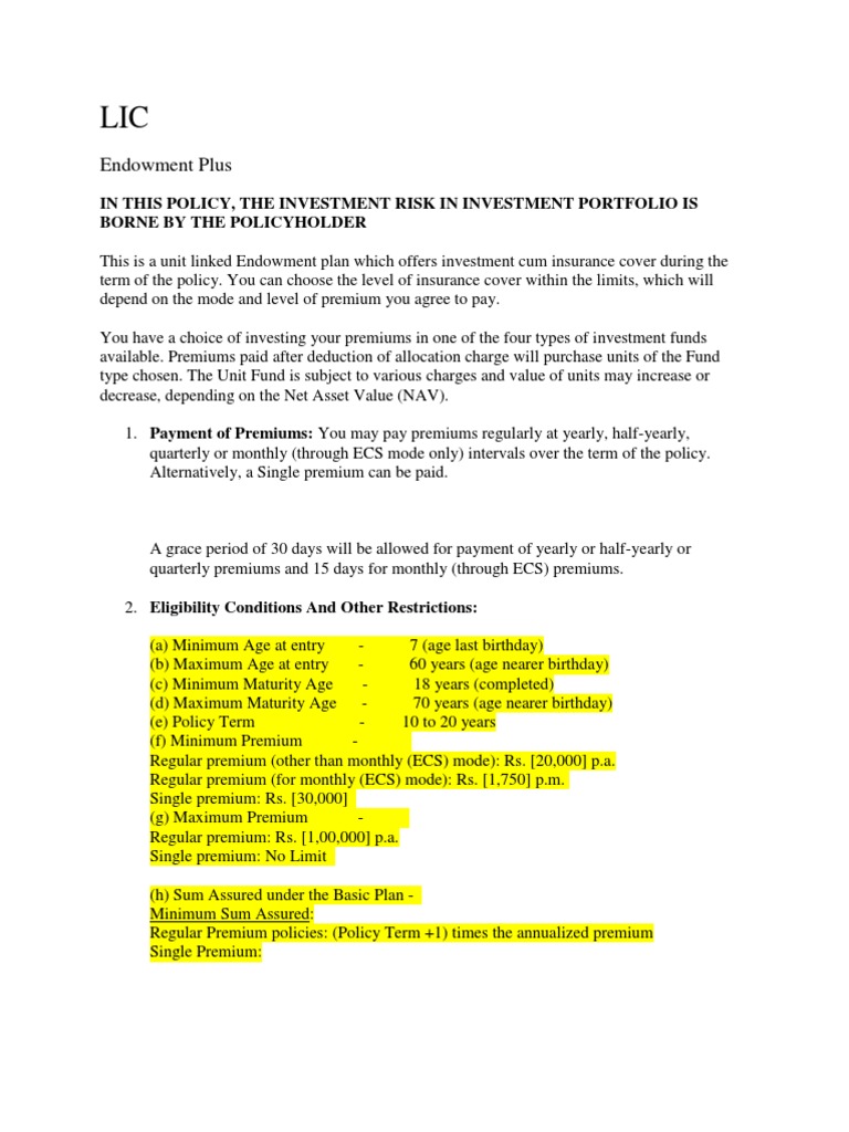 9. Reinstatement: A policy once surrendered cannot be reinstated. 10. Risks borne by the Policyholder: 11. LICs Endowment Plus is a Unit Linked Life Insurance products which is different from the traditional insurance products and are subject to the risk factors. 12. The premium paid in Unit Linked Life Insurance policies are subject to investment risks associated with capital markets and the NAVs of the units may go up or down based on the performance of fund and factors influencing the capital market and the insured is responsible for his/her decisions. 13. Life Insurance Corporation of India is only the name of the Insurance Company and LICs Endowment Plus is only the name of the unit linked life insurance contract and does not in any way indicate the quality of the contract, its future prospects or returns. 14. Please know the associated risks and the applicable charges, from your Insurance agent or the Intermediary or policy document of the insurer. 15. The various funds offered under this contract are the names of the funds and do not in any way indicate the quality of these plans, their future prospects and returns. 16. All benefits under the policy are also subject to the Tax Laws and other financial enactments as they exist from time to time.