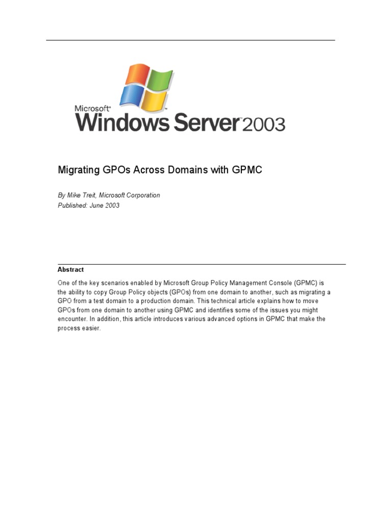 Abstract One of the key scenarios enabled by Microsoft Group Policy Management Console (GPMC) is the ability to copy Group Policy objects (GPOs) from one domain to another, such as migrating a GPO from a test domain to a production domain. This technical article explains how to move GPOs from one domain to another using GPMC and identifies some of the issues you might encounter. In addition, this article introduces various advanced options in GPMC that make the process easier.