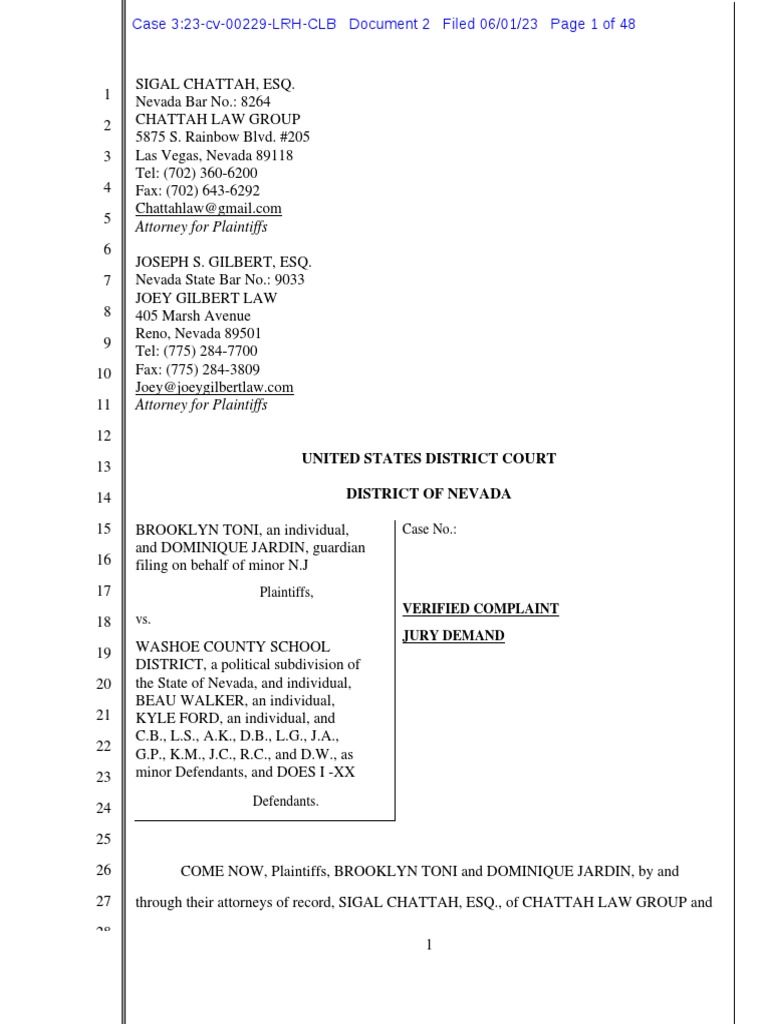 This document is a verified complaint filed in United States District Court alleging civil rights violations against the Washoe County School District, Galena High School Dean Beau Walker, s…