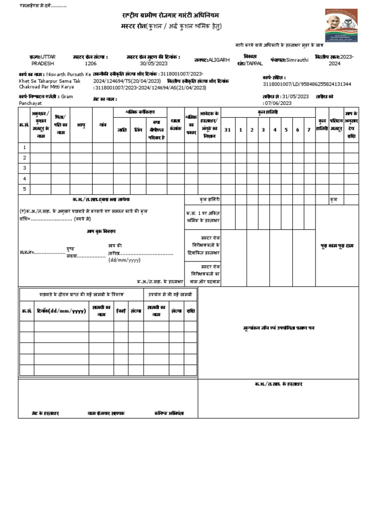 राज्य:UTTAR मस्टर रोल संख्या : मस्टर रोल मुद्रण की दिनांक : विकास वित्तीय साल:2023-
