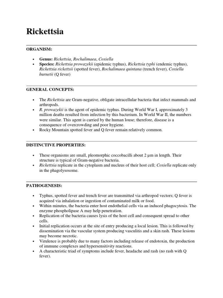Genus: Rickettsia, Rochalimaea, Coxiella Species: Rickettsia prowazekii (epidemic typhus), Rickettsia typhi (endemic typhus), Rickettsia rickettsii (spotted fever), Rochalimaea quintana (trench fever), Coxiella burnetii (Q fever)