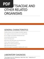 Clinical: These diseases present as febrile illnesses after exposure to arthropods or animal hosts or aerosols in endemic areas and are easily misdiagnosed. A delay in diagnosis may be partly responsible for the high mortality from Spotted fever. The spread of the rash is often characteristic: spread from the trunk to the extremities (centrifugal) is typical for typhus; spread from the extremities to the trunk (centripetal) is typical for spotted fever. Laboratory: The use of immunofluorescent antibodies to examine a biopsy can be diagnostic. The organism can be inoculated into tissue culture and grown over 4-7 days but this is very hazardous to personnel. The Weil-Felix test looks for the production of serum antibody that is reactive against Proteus OX19, OX2 or OXK antigens but it is not always reliable.