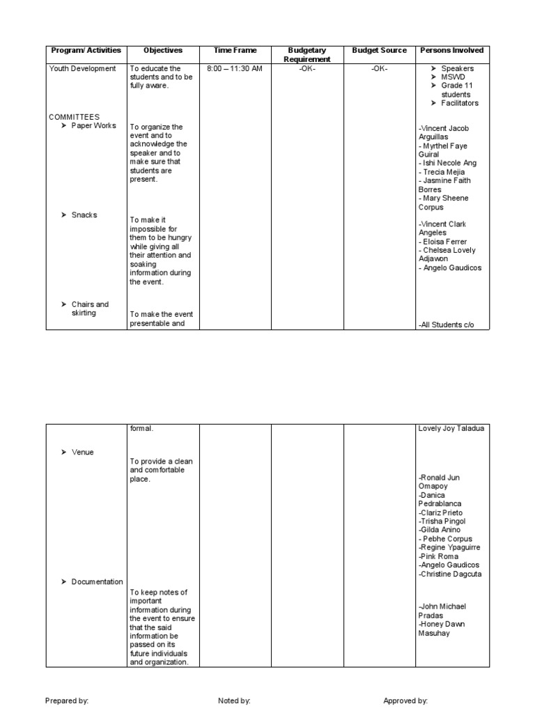 Program/ Activities Objectives Time Frame Budgetary Budget Source Persons Involved