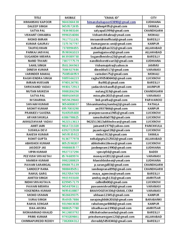 TITLE MOBILE "EMAIL ID" CITY