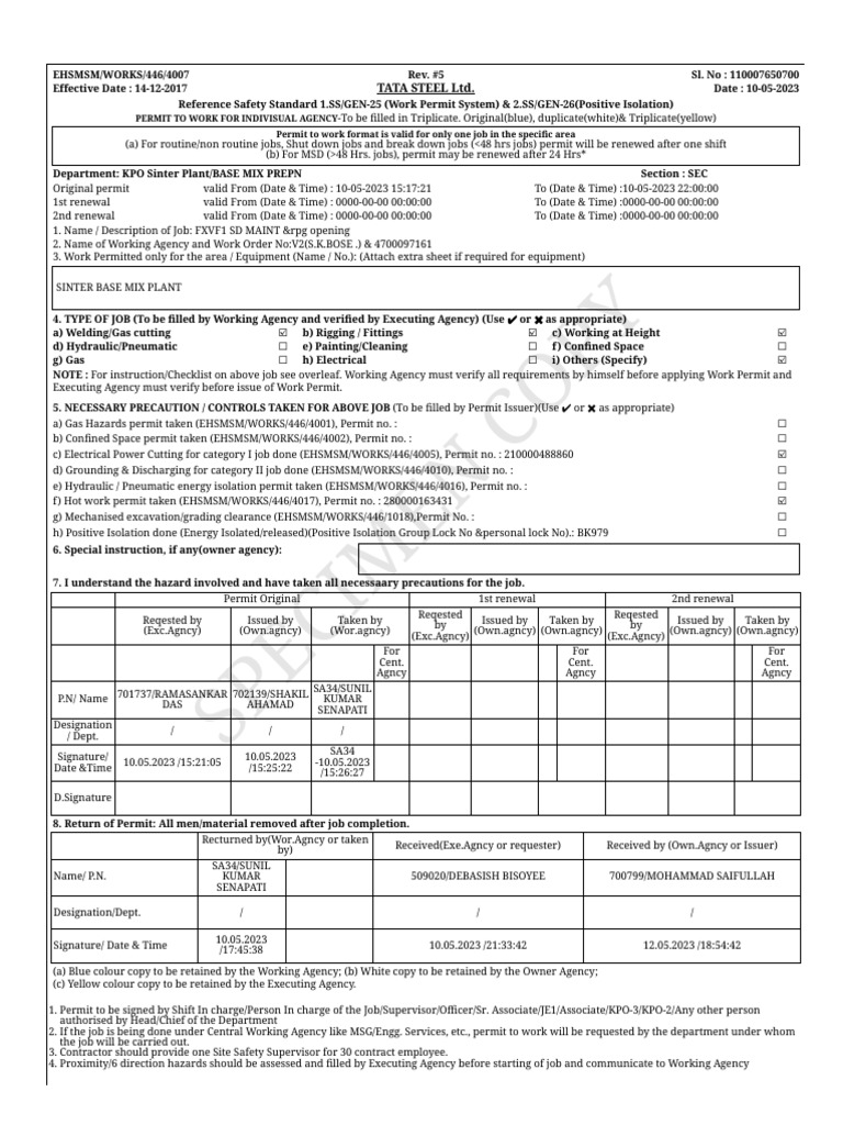 1. Permit to be signed by Shift In charge/Person In charge of the Job/Supervisor/Officer/Sr. Associate/JE1/Associate/KPO-3/KPO-2/Any other person