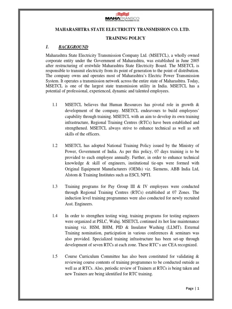 1.2 MSETCL has adopted National Training Policy issued by the Ministry of