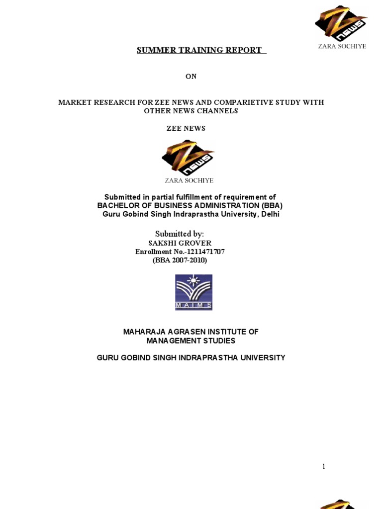 This is to certify that the Training Report MARKET RESEARCH FOR ZEE NEWS AND COMPARIETIVE STUDY WITH OTHER NEWS CHANNELS submitted in partial fulfillment of the requirements for the award of the degree of BACHELOR OF BUSINESS ADMINISTRATION TO GURU GOBIND SINGH INDRAPRASTHA UNIVERSITY Is a record of bonafide training carried out by SAKSHI GROVER Under my supervision and guidance and that no part of this report has Been submitted for the award of any other degree/ diploma/ fellowship or similar titles or prizes.