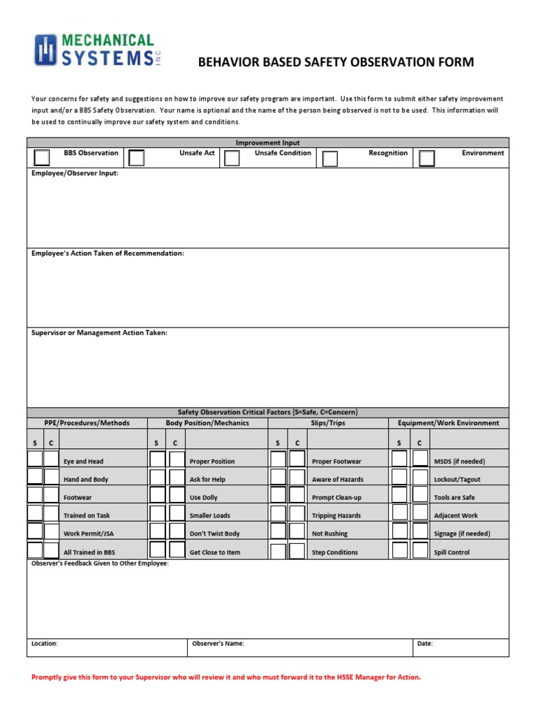 BEHAVIOR BASED SAFETY OBSERVATION FORM