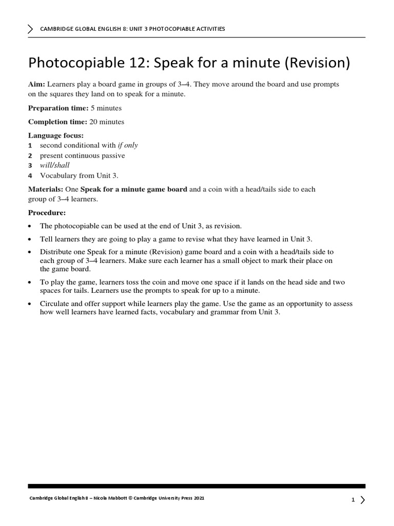 • Distribute one Speak for a minute (Revision) game board and a coin with a head/tails side to