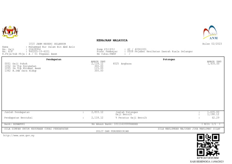 No. K/P : 940205-10-6221 Pusat Pembayar : 0008 Pejabat Kesihatan Daerah Kuala Selangor