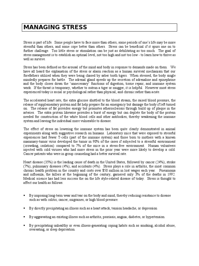 limit sweets, and add fruits and vegetables. Foods high in vitamin B such as leafy green vegetables are particularly good for stress. Remember to watch you intake of caffeine, tobacco, and alcohol. A healthier diet not only can decrease fatigue and irritability, typically associated with stress symptoms, but can prevent certain stress from arising. A person who has a healthier lifestyle is less likely to develop health problems, which become another stressor one must deal with. In our weight conscious society one generally feels better about oneself, and is responded to more favorably, if he/she is not overweight. Sleep: A large number of Americans function in a sleep-deprived state. Although there are individual differences, most adults function better on eight hours of sleep. Albert Einstein reportedly needed 11 hours (Schafer). Time Management/Prioritize: You cannot do everything at once, and depending on your lifestyle, may never be able to do all you would like to do (or feel you must do). Firstly, sit down and evaluate your life. Are you really spending it on the important things or are they getting lost in lifes race? Are you feeling stressed because you never seem to have time and energy to spend with those you love or your favorite activity? Divide your life into long and short term goals. What steps need to be taken to meet the long term goals? Start at the beginning of each day by listing what you need to accomplish (personal and work). Put them in order of importance. Complete the first task before you go to the second, and the second before you go to the third. If urgent enough, the bottom or least pressing, will eventually move up to the top. You can only put off your laundry for so long. Plan tasks that take more creativity or brainpower when you are at your best. Do not try to compose an important letter when you are half asleep. Some people are sharper early in the morning and others do not fully come awake until afternoon. Recreational Outlets: There are a number of things we cannot control in our lives, but having fun is not one of them. Everyone needs to find, and take time, to pursue leisure time activities. Playing cards, dinner with friends, basketball, or going to the movies may not make lifes problems go away, but they do provide a nice respite. Most people know stress is a killer, but still do not follow through with the above recommendations. It does take time that is difficult to find in a busy schedule. It also entails making a deliberate choice to adopt constructive coping mechanisms rather that relying on those that we may have learned growing up. Virginia Satir, the family therapist, succinctly summarized the basis of stress management as follow: Life is not the way its suppose to be. Its the way it is. The way you cope with it is what makes the difference.