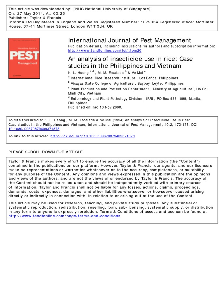 To cite this article: K. L. Heong , M. M. Escalada & Vo Mai (1994) An analysis of insecticide use in rice: