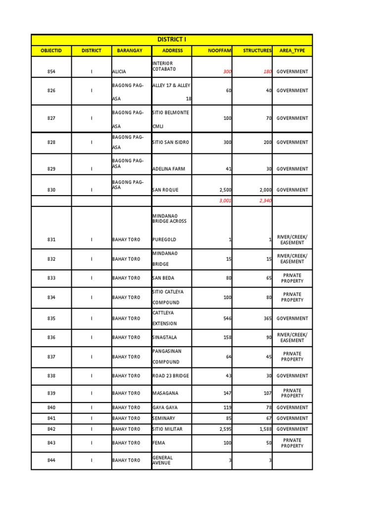 District I & II Area Data Summary
