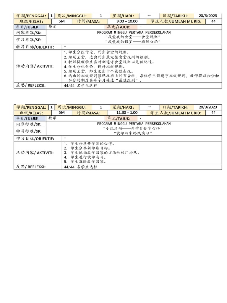 学期/PENGGAL: 1 周次/MINGGU: 1 星期/HARI: 一 日期/TARIKH: 20/3/2023
