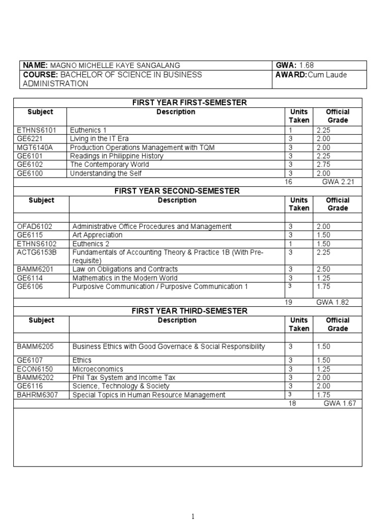 COURSE: BACHELOR OF SCIENCE IN BUSINESS AWARD:Cum Laude