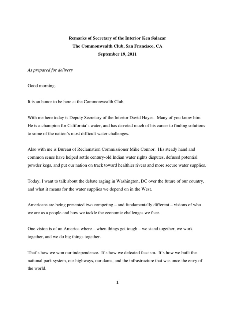 Remarks of Secretary of the Interior Ken Salazar The Commonwealth Club, San Francisco, CA September 19, 2011