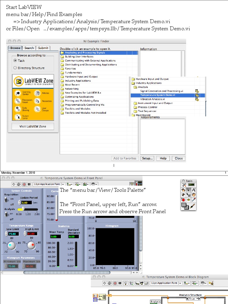 Start LabVIEW menu bar/Help/Find Examples => Industry Applications/Analysis/Temperature System Demo.vi or Files/Open ../examples/apps/tempsys.llb/Temperature System Demo.