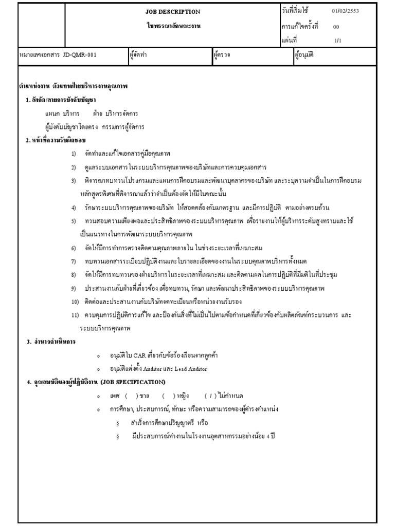 หมายเลขเอกสาร JD-HR-001 ผูจ้ ดั ทำ ผูต้ รวจ ผูอ้ นุมตั ิ