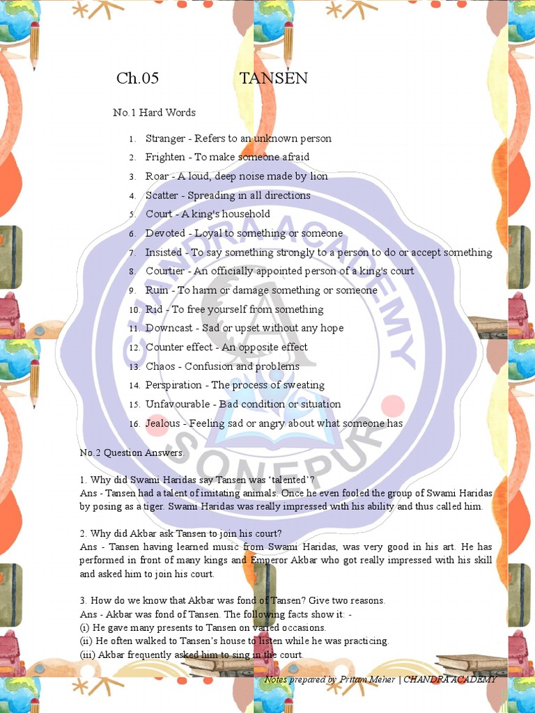 Ans - Tansen had a talent of imitating animals. Once he even fooled the group of Swami Haridas