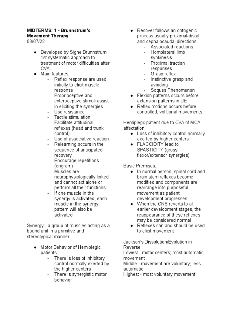 MIDTERMS: 1 - Brunnstrum's ● Recover follows an ontogenic