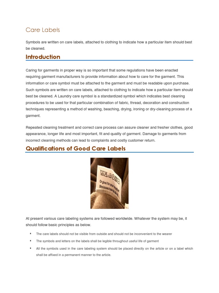 Caring for garments in proper way is so important that some regulations have been enacted requiring garment manufacturers to provide information about how to care for the garment. This information or care symbol must be attached to the garment and must be readable upon purchase. Such symbols are written on care labels, attached to clothing to indicate how a particular item should best be cleaned. A Laundry care symbol is a standardized symbol which indicates best cleaning procedures to be used for that particular combination of fabric, thread, decoration and construction techniques representing a method of washing, beaching, drying, ironing or dry-cleaning process of a garment. Repeated cleaning treatment and correct care process can assure cleaner and fresher clothes, good appearance, longer life and most important, fit and quality of garment. Damage to garments from incorrect cleaning methods can lead to complaints and costly customer return.