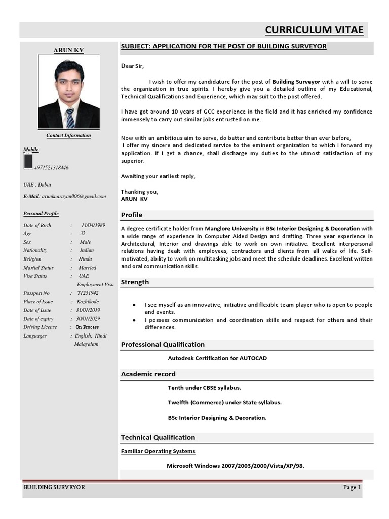 I wish to offer my candidature for the post of Building Surveyor with a will to serve