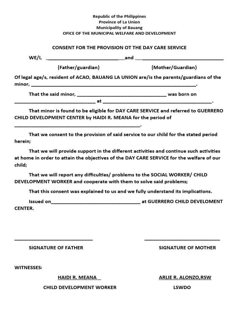 CONSENT FOR THE PROVISION OT THE DAY CARE SERVICE