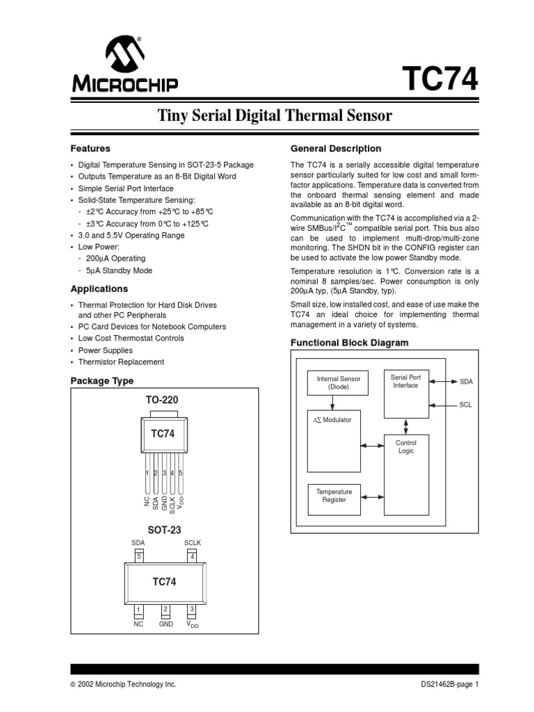 • Digital Temperature Sensing in SOT-23-5 Package The TC74 is a serially accessible digital temperature