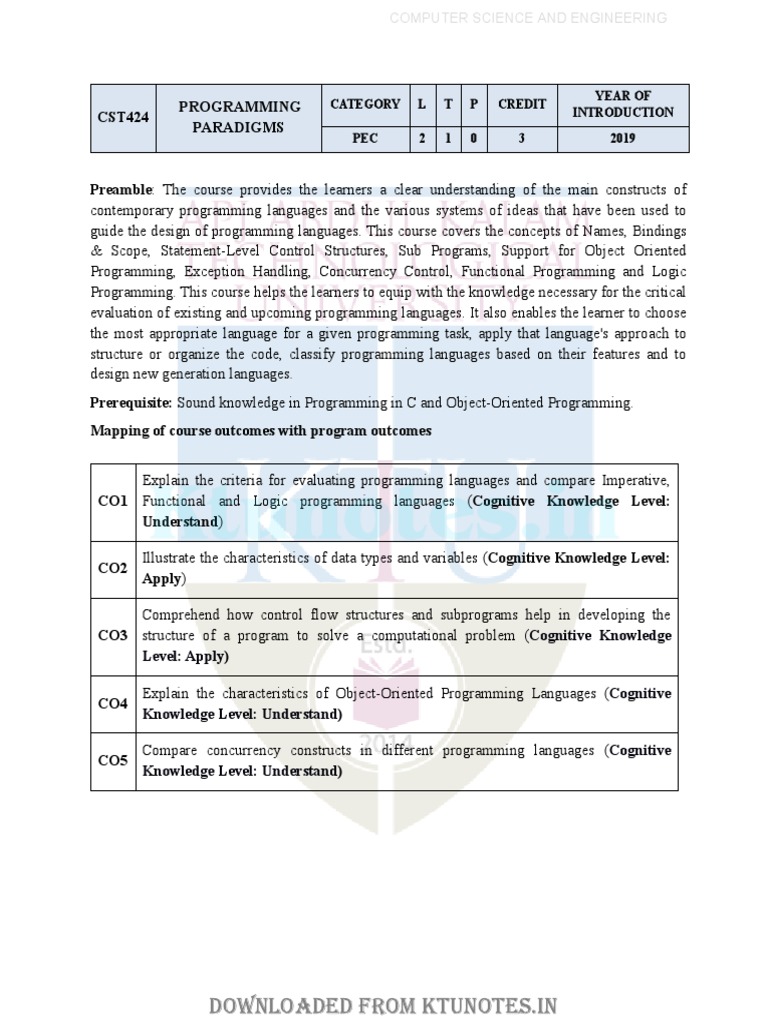CO1 Functional and Logic programming languages (Cognitive Knowledge Level: