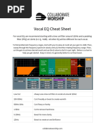 This vocal EQ cheat sheet provides guidance on equalizing vocals. It recommends always using a low cut filter between 150-200Hz and optionally cutting frequencies between 400-700Hz if vocals sound nasaly, boxy or honky. Cutting 2-4kHz can remove harshness and boosting 12kHz adds sparkle. A low shelf at 900Hz may increase clarity if needed.