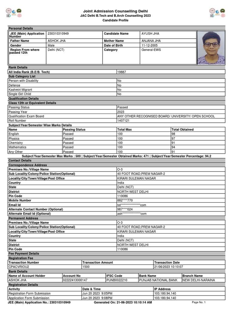 JEE (Main) Application No.: 230310310949 Generated On: 21-06-2023 10:10:14 AM Page No. 1