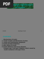 Structure and Chemical Properties of Insulin Insulin was found to be a polypeptide in 1928 with its amino acid sequence identied in 1952. It is in fact a dipeptide, containing A and B chains respectively, linked by disulphide bridges, and containing 51 amino acids, with a molecular weight of 5802. Its iso-electric point is pH 5.5.5 The A chain comprises 21 amino acids and the B chain 30 amino acids. The A chain has an N-terminal helix linked to an anti-parallel Cterminal helix; the B chain has a central helical segment. The two chains are joined by 2 disulphide bonds, which join the N- and C-terminal helices of the A chain to the central helix of the B chain. In pro-insulin, a connecting peptide links the N-terminus of the A chain to the C-terminus of the B chain.6 Synthesis and Release of Insulin Insulin is coded on the short arm of chromosome 117 and synthesised in the cells of the pancreatic islets of Langherhans as its precursor, proinsulin. Proinsulin is synthesised in the ribosomes of the rough endoplasmic reticulum (RER) from mRNA as pre-proinsulin. Pre-proinsulin is formed by sequential synthesis of a signal peptide, the B chain, the connecting (C) peptide and then the A chain comprising a single chain of 100 amino acids. Removal of the signal peptide forms proinsulin, which acquires its characteristic 3 dimensional structure in the endoplasmic reticulum. Secretory vesicles transfer proinsulin from the RER to the Golgi apparatus, whose aqueous zinc and calcium rich environment favours formation of soluble zinc-containing proinsulin hexamers.6 As immature storage vesicles form from the Golgi, enzymes acting outside the Golgi convert proinsulin to insulin and Cpeptide.8 Insulin forms zinc-containing hexamers which are insoluble, precipitating as chemically stable crystals at pH 5.5. When mature granules are secreted into the circulation by exocytosis, insulin, and an equimolar ratio of C-peptide are released. Proinsulin and zinc typically comprise no more than 6% of the islet cell secretion.6 Insulin secretion from the islet cells into the portal veins is characteristically pulsatile, reecting the summation of coordinate secretory bursts from millions of islet cells. An ultradian oscillatory pattern of insulin release, in addition to post meal variation, has been reported.9 In response to a stimulus such as glucose, insulin secretion is characteristically biphasic, with an initial rapid phase of insulin secretion, followed by a less intense but more sustained release of the hormone.10 Factors Inuencing Insulin Biosynthesis and Release Insulin secretion may be inuenced by alterations in synthesis at the level of gene transcription, translation, and post-translational modication in the Golgi as well as by factors inuencing insulin release from secretory granules.