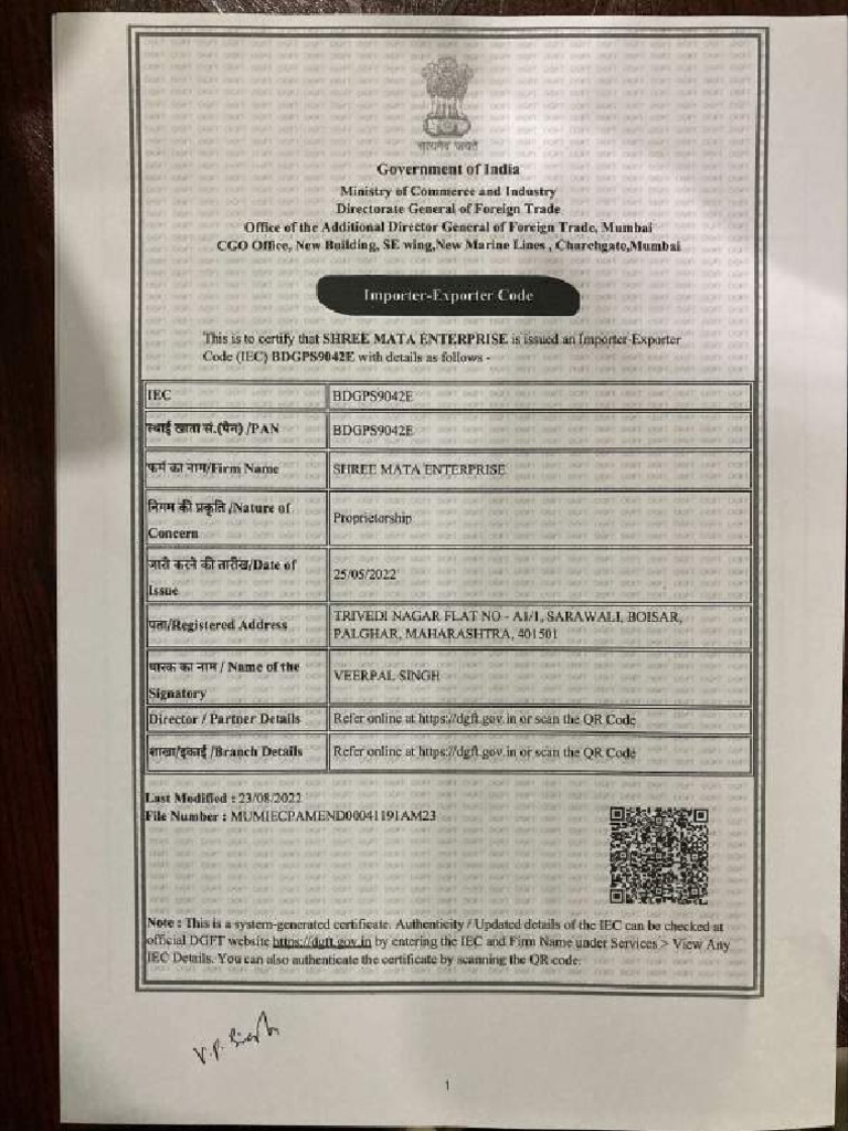 ‘This i$ to certify that SAREE MATA ENTERPRISE is ised ani Importer Exporter