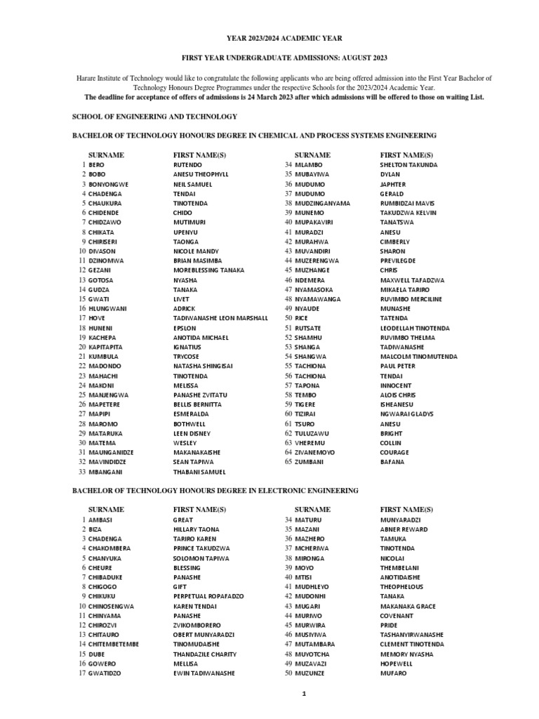 Harare Institute of Technology would like to congratulate the following applicants who are being offered admission into the First Year Bachelor of
