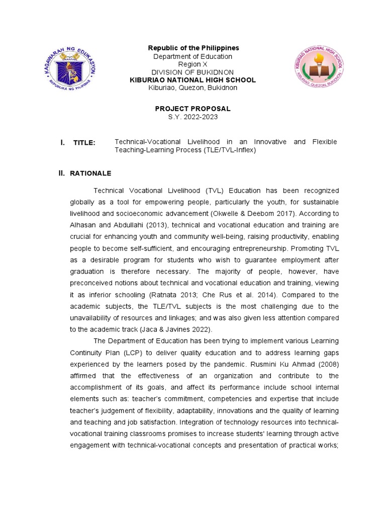 I. TITLE: Technical-Vocational Livelihood in an Innovative and Flexible