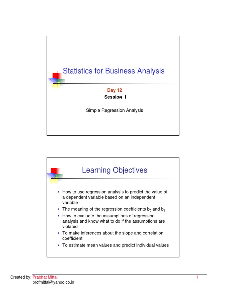 How to use regression analysis to predict the value of a dependent variable based on an independent variable The meaning of the regression coefficients b0 and b1 How to evaluate the assumptions of regression analysis and know what to do if the assumptions are violated To make inferences about the slope and correlation coefficient To estimate mean values and predict individual values