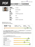 Japan Foundation Test Results: The page provides notification of assessment results from the Japan Foundation Test for Basic Japanese, detailing personal information, scores, and evaluative comments.