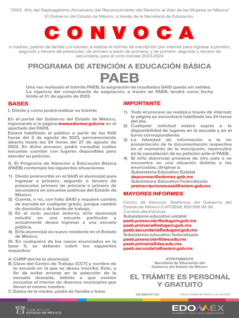 “2023. Afio del Septuagésimo Aniversario de! Reconocimiento del Derecho al Voto de las Mujeres en México” EI Gobierno del Estado de México, a través de la Secretaria de Educaci6n, CONVOCA amadres, padres de familia y/o tutores, a realizar el tramite de inscripcién por internet para ingresar a primero, segundo y tercero de preescolar; de primero a sexto de primaria; y de primero, segundo y tercero de secundaria, para el ciclo escolar 2023-2024 PROGRAMA DE ATENCION A EDUCACION BASICA PAEB Una vez realizado el tramite PAEB, la asignacién de resultados SAID queda sin validez. La vigencia del comprobante de asignaci6n, a través de PAEB, tendra como fecha limite el 31 de agosto de 2023. BASES I. Dénde y cémo podra realizar su tramite En el portal del Gobierno del Estado de México, ingresando a la pagina wwwedomex.gob.mx en el apartado del PAEB. Estara habilitado al publico a partir de las 9:00 horas del 2 de agosto de 2023, permaneciendo abierto hasta las 24 horas del 27 de agosto de 2023. En dicho proceso, podra consultar cuales escuelas cuentan con lugares disponibles para atender su peticion. Il. El Programa de Atencién a Educacién Basica (PAEB) contempla las siguientes situaciones: 1) Olvidé preinscribir en el SAID al alumno(a) para ingresar a primero, segundo o tercero de preescolar; primero de primaria o primero de secundaria en escuelas publicas del Estado de México. 2) Cuenta, 0 no, con folio SAID y requiere cambio de escuela en cualquier grado, porque cambi6 de domicilio o de fuente de trabajo. 3) En el ciclo escolar anterior, el/la_alumno(a) estudié en una escuela particular y actualmente desea ingresar a una escuela publica. 4) El/ia alumno(a) es nuevo residente en el Estado de México. I En cualquiera de los casos enunciados en la base Il, se deberén cubrir los siguientes requisitos: A.CURP del/de la alumno(a). B.Clave del Centro de Trabajo (CCT) y nombre de la escuela en la que se desea inscribir. Esto, a fin de evitar errores en la seleccion de la escuela deseada, debido a que existen escuelas al interior de diversos municipios que llevan el mismo nombre. C.Datos de la madre, padre de familia o tutor. re ent Taa ta) IMPORTANTE 4) Todo el proceso se realizaa través de internet; la pagina se encontraré habilitada las 24 horas, del dia. 2) Cualquier solicitud estara sujeta a la disponibilidad de lugares en la escuela y en el turno correspondiente. 3) La falsedad de informacién o la no presentacién de la documentacién respectiva en el momento de Ia inscripcién, repercutira enla cancelaci6n de su peticion ante el PAEB. 4) Si el/la alumno(a) proviene de otro pais o se encuentra en una situacién distinta a las enunciadas, dirigirse a: Subsistema Educativo Estatal depconesc@edomex.gob.mx Subsistema Educativo Federalizado preinscripciones said@seiem.gob.mx MAYORES INFORMES. Centro de Atencién Telefonica del Gobierno del Estado de México (CATGEM) 800 696 96 96. Correos electrénicos: Subsistema educativo estatal paeb.preescolar@edugemgob.mx paeb.primaria@edugem.gob.mx paeb.secundaria@edugemgob.mx Subsistema educativo federalizado paeb.preescolar@dee.edu.mx paeb.primaria@dee.edu.mx paeb.secundaria@seiem.gob.mx ATENTAMENTE Secretaria de Educacién de! Gobierno del Estado de México EL TRAMITE ES PERSONAL Y GRATUITO ce 2057128 “Toluca, Esta de México, jlo 2028,