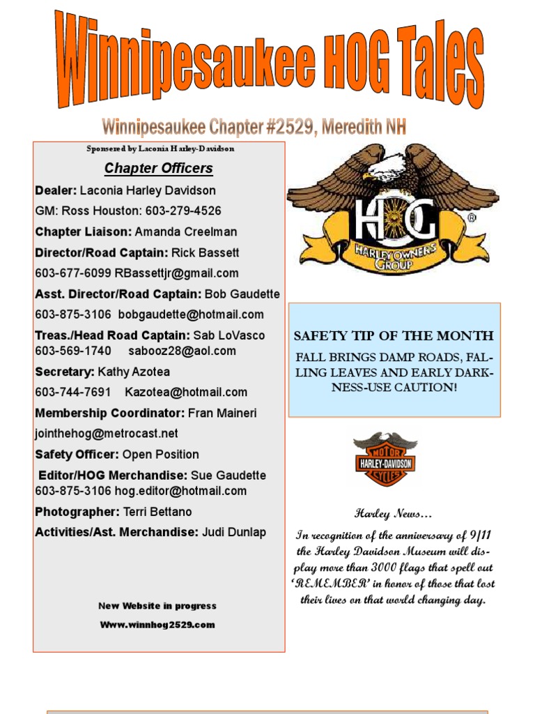 Dealer: Laconia Harley Davidson GM: Ross Houston: 603-279-4526 Chapter Liaison: Amanda Creelman Director/Road Captain: Rick Bassett 603-677-6099 RBassettjr@[Link] Asst. Director/Road Captain: Bob Gaudette 603-875-3106 bobgaudette@[Link] Treas./Head Road Captain: Sab LoVasco 603-569-1740 sabooz28@[Link] Secretary: Kathy Azotea 603-744-7691 Kazotea@[Link] Membership Coordinator: Fran Maineri jointhehog@[Link] Safety Officer: Open Position Editor/HOG Merchandise: Sue Gaudette 603-875-3106 [Link]@[Link] Photographer: Terri Bettano Activities/Ast. Merchandise: Judi Dunlap Harley News In recognition of the anniversary of 9/11 the Harley Davidson Museum will display more than 3000 flags that spell out REMEMBER in honor of those that lost their lives on that world changing day.