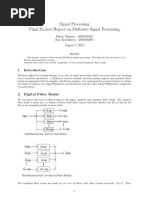 The output of filternoise.m produces 4 figures. The time domain and frequency domain representations of the input signal and 3 output signals corresponding to LPF, BPF, and HPF. These plots are shown in Figures 2-5 below. Observe that the spectra at the output of the filters are close approximations to the ideals shown in Figure 1. There are some difierences, however. While the idealized spectra are completely at in the passband, the actual ones are rippled. While the idealized spectra completely reject the out-of-band frequencies, the actual ones have small (but nonzero) energy at all frequencies. 2
