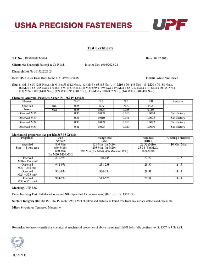 Remarks: We hereby certify that chemical & mechanical properties of above mentioned HSFG bolts fully confirms to IS: 1367 Ps3 Gr 8.8S.