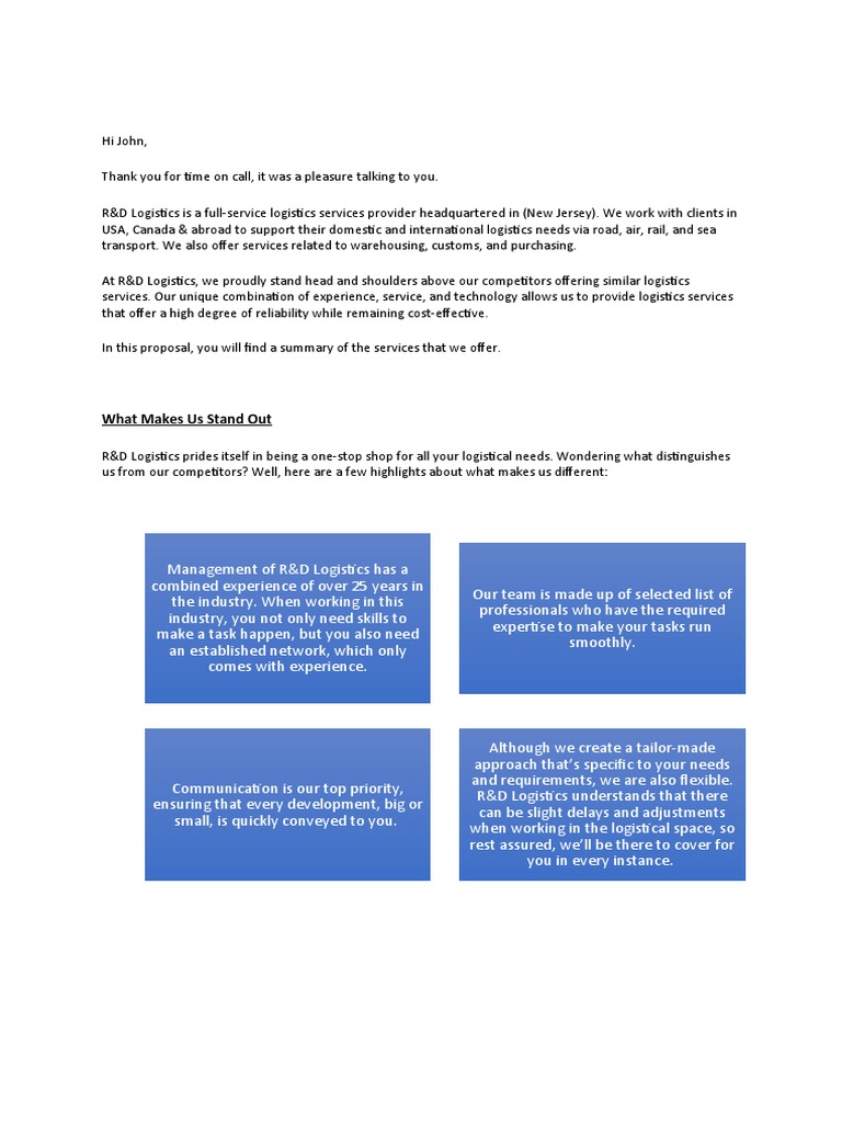 On behalf of the entire team at R&D Logistics, I thank you for the opportunity to earn your business. We look