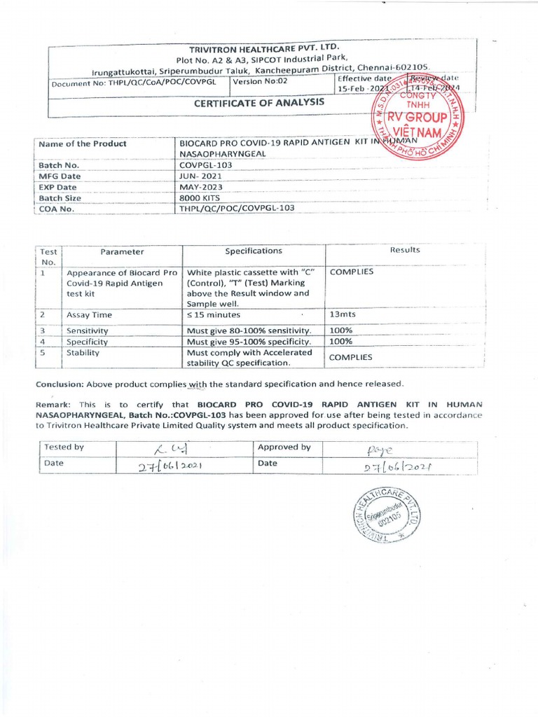 NASAOPHARYNGEAL, Batch No.:COVPGL-103 has been approved for use after being tested in accordance