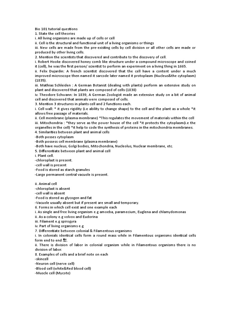 Bio 101 tutorial questions